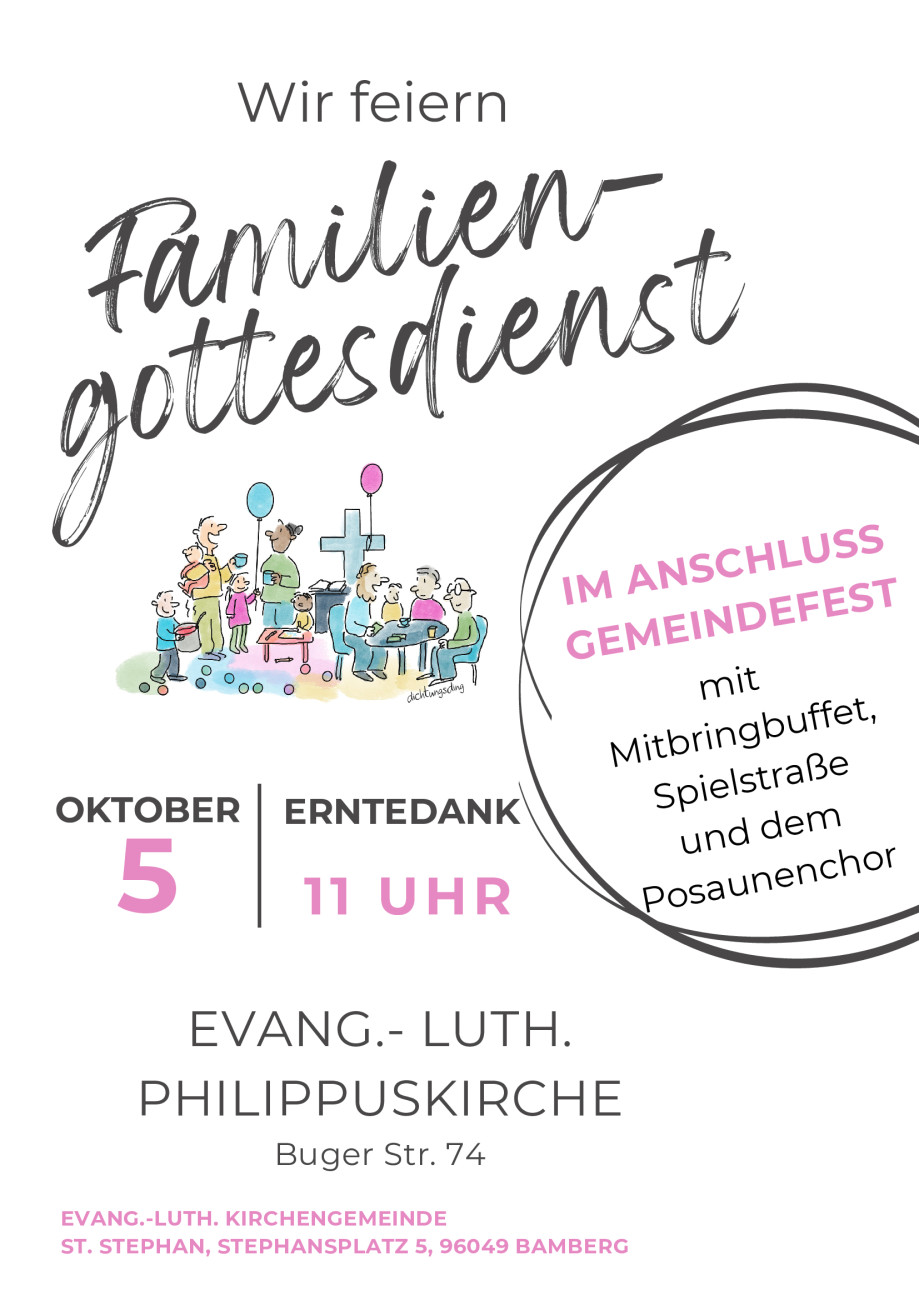 Am Sonntag, 5. Oktober, findet in Philippus der Erntedank-Familiengottesdienst und anschließend das Gemeindefest statt - siehe den Artikel weiter unten auf dieser Seite. In Stegaurach findet daher an diesem Abend kein Abendgottesdienst mehr statt. Sie sind alle herzlich nach Philippus (oder St. Stephan) eingeladen.